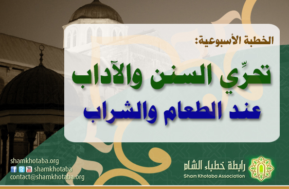 ومِن آداب الطّعام والشّراب: أن يسمّي الله جل جلاله قبل طعامه وشرابه، عَنْ جَابِرِ بْنِ عَبْدِ اللهِ رضي الله عنه، أَنَّهُ سَمِعَ النَّبِيَّ صلى الله عليه وسلم يَقُولُ: (إِذَا دَخَلَ الرَّجُلُ بَيْتَهُ، فَذَكَرَ اللهَ عِنْدَ دُخُولِهِ وَعِنْدَ طَعَامِهِ، قَالَ الشَّيْطَانُ: لَا مَبِيتَ لَكُمْ، وَلَا عَشَاءَ، وَإِذَا دَخَلَ، فَلَمْ يَذْكُرِ اللهَ عِنْدَ دُخُولِهِ، قَالَ الشَّيْطَانُ: أَدْرَكْتُمُ الْمَبِيتَ، وَإِذَا لَمْ يَذْكُرِ اللهَ عِنْدَ طَعَامِهِ، قَالَ: أَدْرَكْتُمُ الْمَبِيتَ وَالْعَشَاءَ).