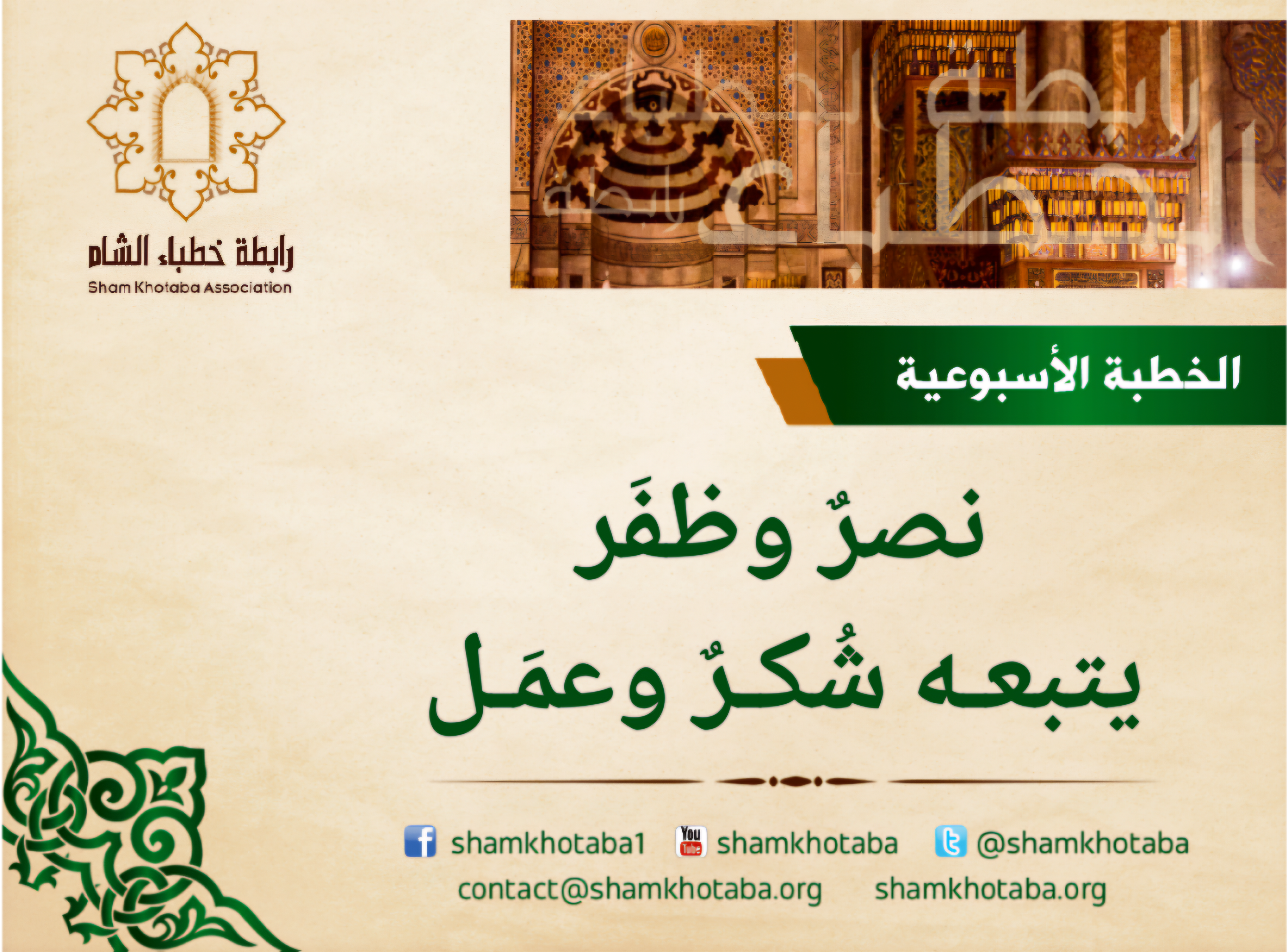 والواجب علينا اليوم أن نزيد يقيننا بموعودات الله سبحانه، وأن نستغفر لما أظهرنا مِن يأسٍ، وأن نشكر الله على ما أنعم، فكيف نشكر؟ الشّكر يكون بالعمَل، أن نشمّر عن ساعد الجدِّ، وأن ينهض كلٌّ منّا -في الموقع الّذي هو فيه- فيعمل أحسن العمل وأجوده، ويتقن بالغ الإتقان، فإنّ الكرّة الآن في ملعبنا، وأمامنا وطنٌ جريحٌ يحتاج جهودًا جبّارةً لاستنقاذه، وإنّ شبابًا أظهروا عزمًا صلبًا أطاح بأكبر وأعتى الطّغاة، جديرون أن يظهروا عزمًا صلبًا كذلك في إعمار ما هدمه الطّاغية، ولنتساعد مع أشقّائنا في نهضة هذا البلد وعمارته، ولنتنافس في خدمته بدل التّنازع، فالتّنازع -قد علمتم- فشلٌ.