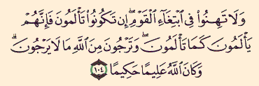 ( وَلَا تَهِنُوا فِي ابْتِغَاءِ الْقَوْمِ إِنْ تَكُونُوا تَأْلَمُونَ فَإِنَّهُمْ يَأْلَمُونَ كَمَا تَأْلَمُونَ وَتَرْجُونَ مِنَ اللَّهِ مَا لَا يَرْجُونَ وَكَانَ اللَّهُ عَلِيمًا حَكِيمًا ) [النساء: 104].
