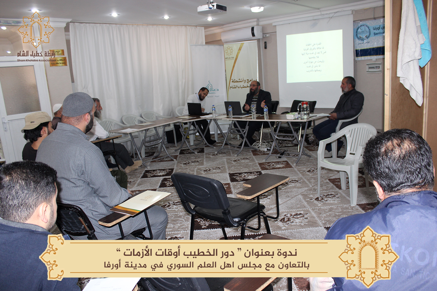 أقامت رابطة خطباء الشام مساء يوم السبت الموافق 27/4/2019 م في مدينة أورفا التركية ندوة بعنوان: "دور الخطيب وقت الأزمات" ضمن مشروع "الندوات المتخصصة في دراسات المنبر" حضرها ثلةٌ من الخطباء والباحثين.