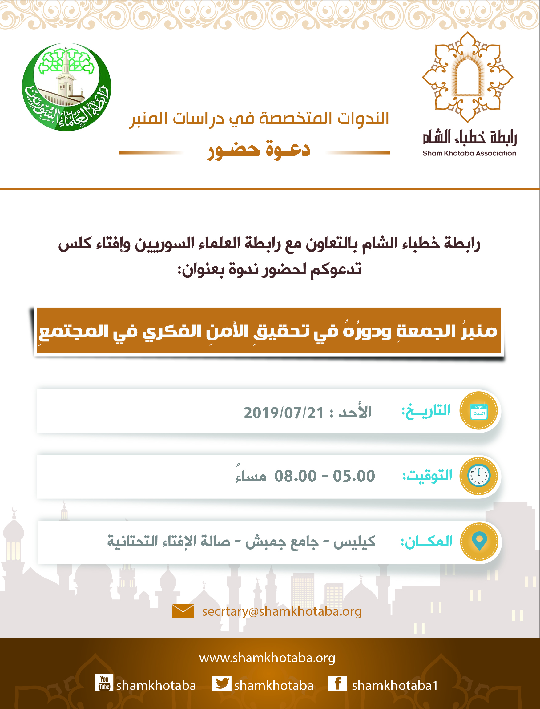 تدعوكم لحضور ندوة بعنوان: "منبر الجمعة ودوره في تحقيق الأمن الفكري في المجتمع"