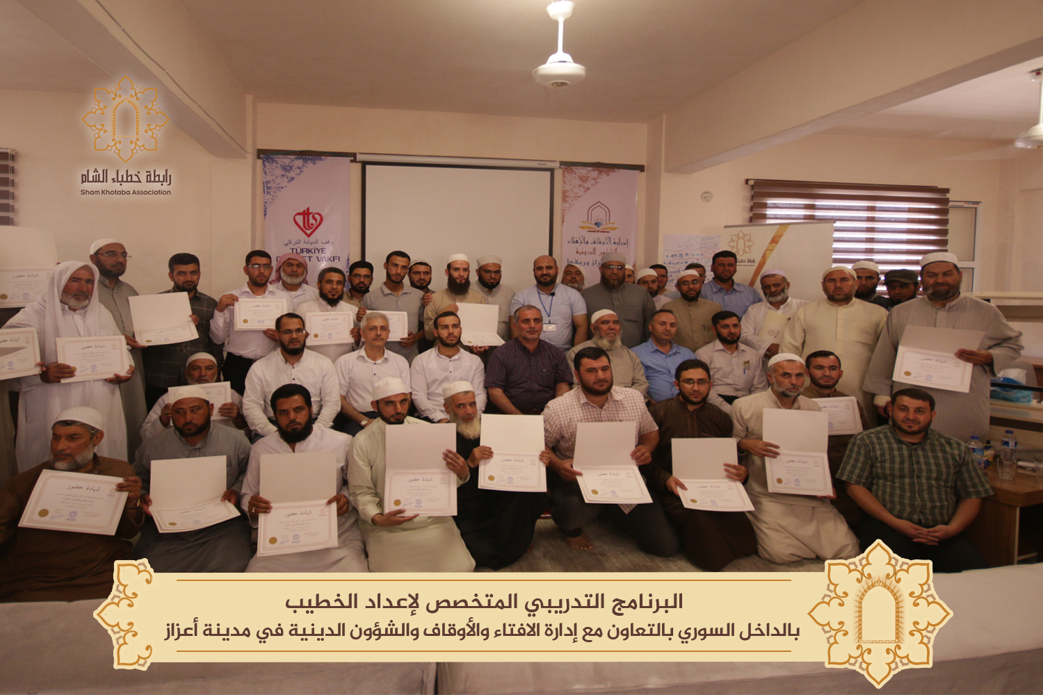 حيث ألقى كل من مفتي ولاية كلس ومدير أوقاف أعزاز والمدير التنفيذي لرابطة خطباء الشام كلمات حول مشروع صناعة الخطيب وواقع الخطباء في المنطقة؛ ثم اختتم البرنامج بتوزيع الشهادات وتكريم المجموعات المتميزة.
