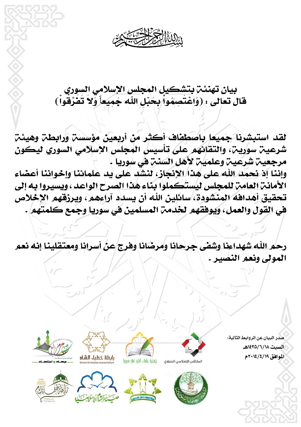 بيان تهنئة بتشكيل المجلس الإسلامي السوري