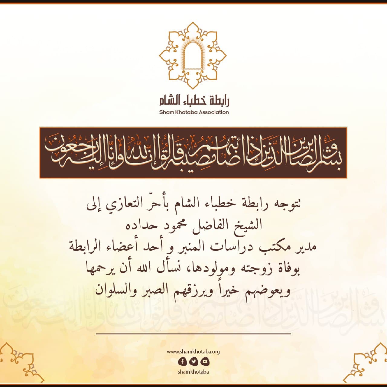 تتوجه رابطة خطباء الشام بأحرّ التعازي إلى الشيخ الفاضل محمود حداده