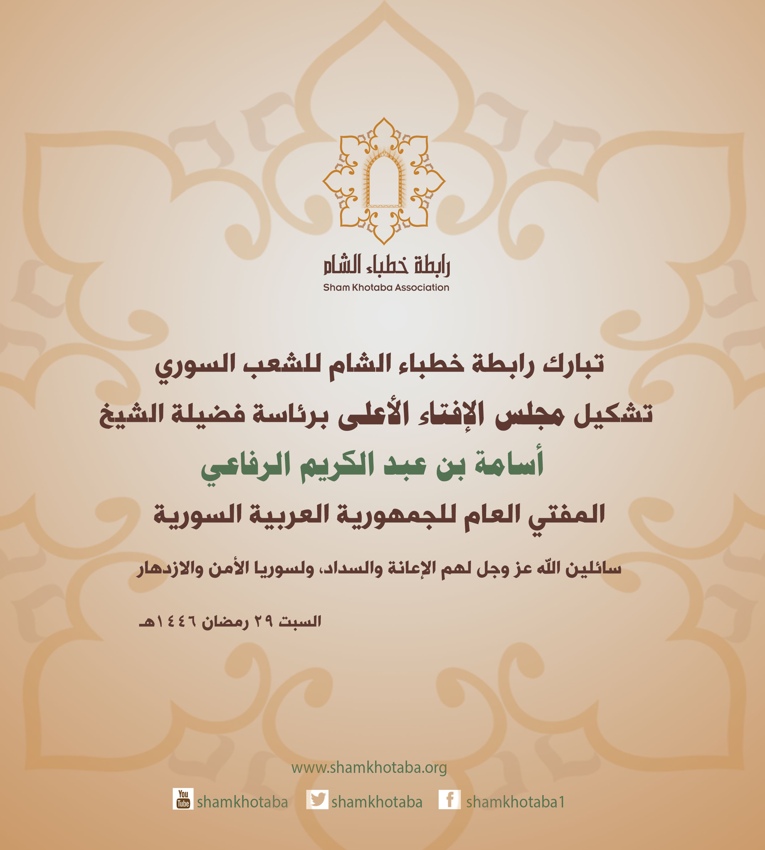 تبارك رابطة خطباء الشام للشعب السوري تشكيل مجلس الإفتاء الأعلى برئاسة فضيلة الشيخ أسامة بن عبد الكريم الرفاعي المفتي العام للجمهورية العربية السورية