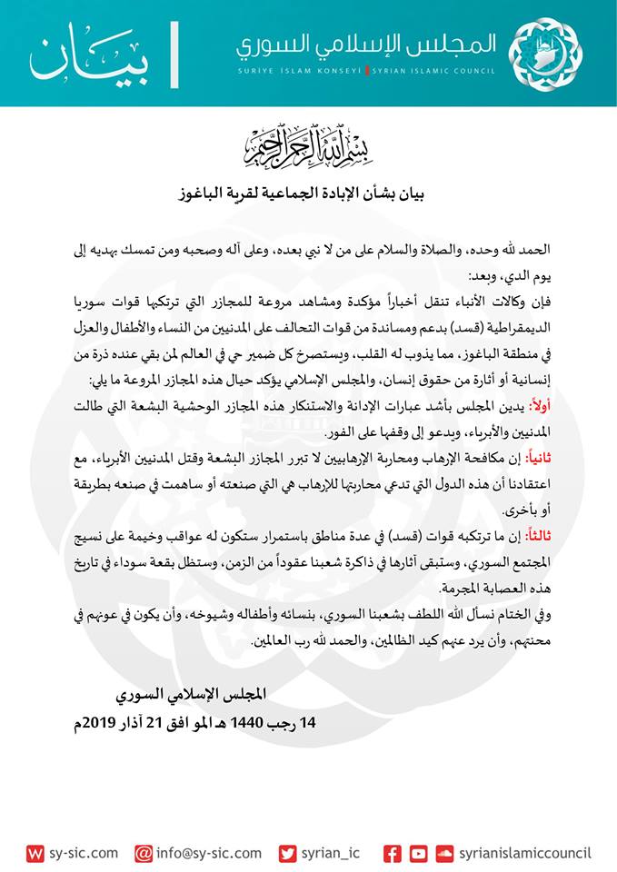 فإن وكالات الأنباء تنقل أخباراً مؤكدة ومشاهد مروعة للمجازر التي ترتكبها قوات سوريا الديمقراطية (قسد) بدعم ومساندة من قوات التحالف على المدنيين من النساء والأطفال والعزل في منطقة الباغوز، مما يذوب له القلب، ويستصرخ كل ضمير حي في العالم لمن بقي عنده ذرة من إنسانية أو أثارة من حقوق إنسان، والمجلس الإسلامي يؤكد حيال هذه المجازر المروعة ما يلي: